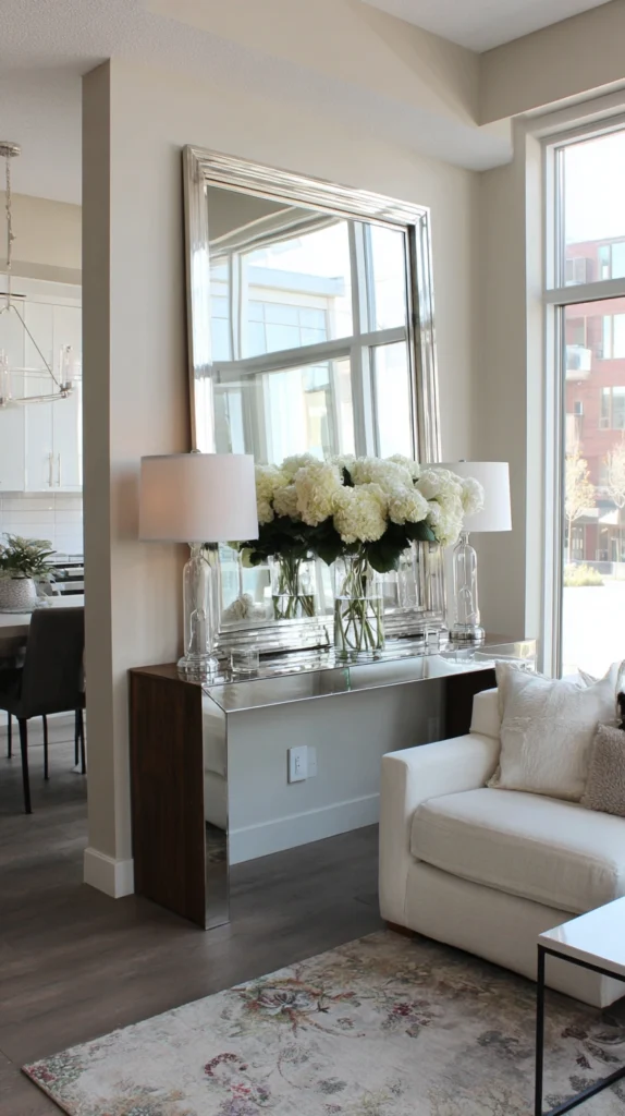 Mirrors in a large living room perform a different function from those in a small space. Rather than creating the illusion of additional room, large mirrors in a generous living room amplify the existing light and space, creating a sense of even greater openness and luminosity while adding the reflective shimmer and visual depth that mirrors uniquely contribute to any interior.