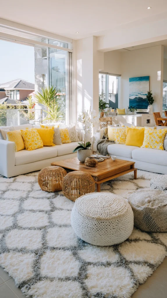 The rug should be large enough for all four legs of every piece of furniture within the seating zone to sit on its surface. a rug that is too small makes the furniture appear to be perching on its edges rather than genuinely anchored within the defined zone. Choose a rug with a pattern, texture, or color that contributes to the room’s design story rather than simply providing a neutral floor covering.