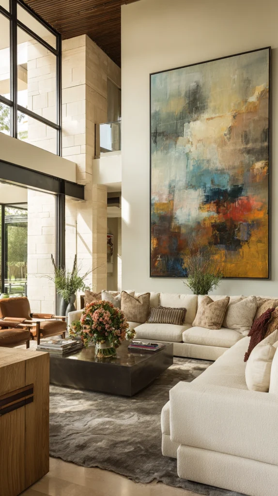 Artwork in a large living room must be specified at a scale appropriate to the generous wall surfaces and high ceilings of the space.