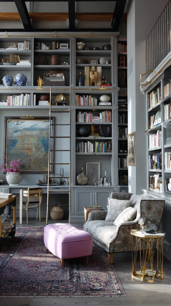 The shelving uses the full vertical height of the space rather than leaving the wall above standard shelf height empty and unaddressed, and the books, ceramics, and objects displayed on the shelves bring warmth, personality, and visual complexity to a wall that would otherwise read as simply a large, empty surface. Add a rolling library ladder for the most dramatic and most functional interpretation of the floor-to-ceiling shelving concept.