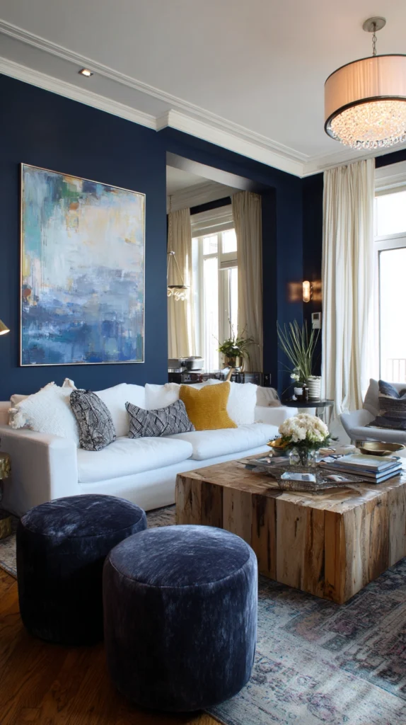 A large living room can absorb and benefit from bold paint colors and dramatic wallpaper in a way that smaller rooms cannot. A deep, saturated wall color. a rich forest green, a warm burgundy, a deep navy, or an enveloping charcoal. creates a sense of intimacy and enclosure in a large room that prevents it from feeling cavernous or cold.