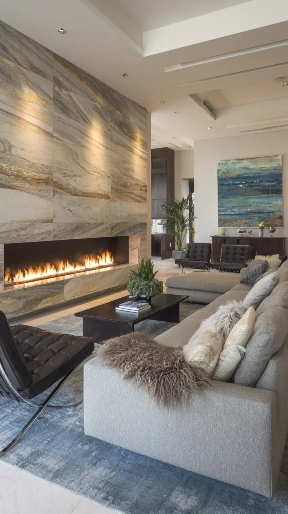 A large, well-proportioned fireplace with a beautiful surround and a mantelpiece dressed with considered accessories creates the warm, human-scaled center of gravity that a large living room needs to feel genuinely inhabited rather than simply spacious.