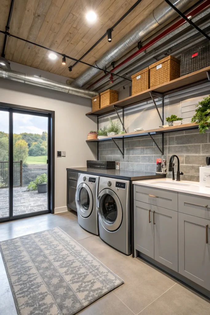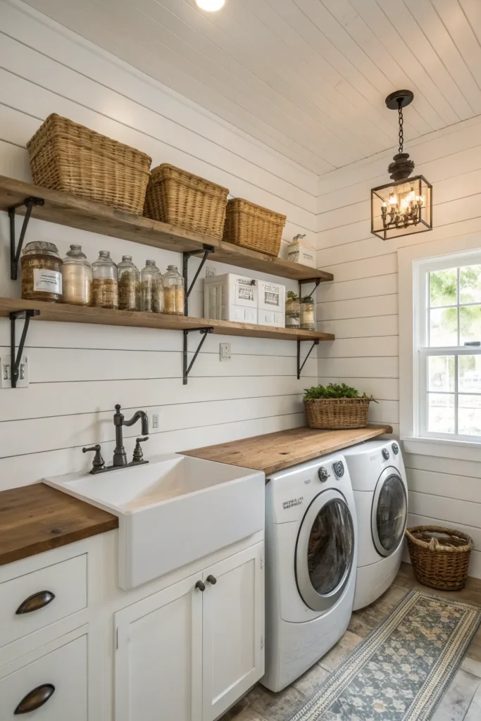 Create a welcoming laundry space with rustic farmhouse elements that add warmth and character to utilitarian functions.