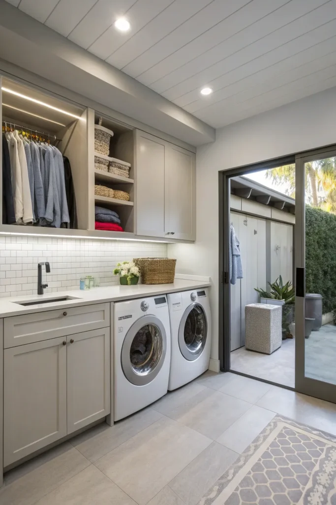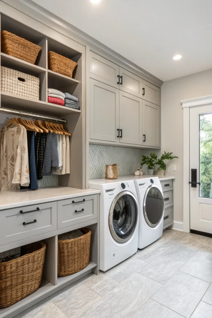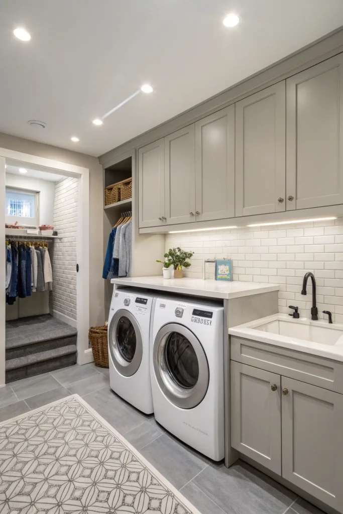 Combine laundry facilities with entryway storage and mudroom functionality for busy families.