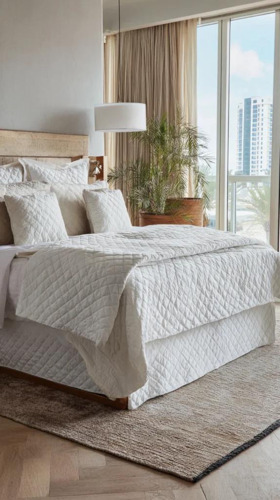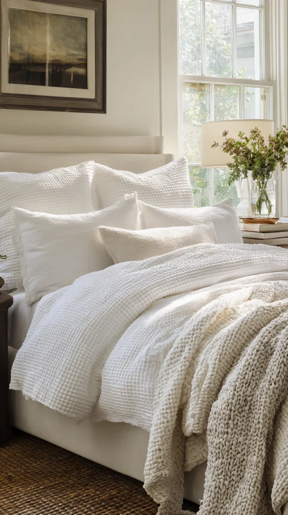 The most classic designer look is the all-white bed, but the secret to preventing it from looking like a hospital room is texture. Use three different white fabrics: a crisp percale bottom sheet, a textured waffle-knit middle blanket, and a heavy linen duvet on top.