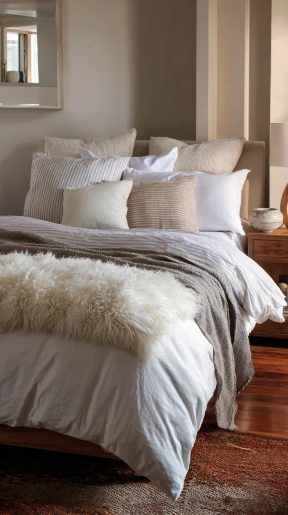 Perfect symmetry can sometimes feel a bit dated or “stiff.” To achieve a modern designer look, try the asymmetrical throw. Instead of folding your decorative blanket perfectly across the foot of the bed, “toss” it over one corner so it drapes naturally toward the floor. This creates a sense of effortless luxury, as if the bed was just styled for a high-end editorial shoot. This works best with a high-texture throw, like a chunky wool knit or a faux-fur.