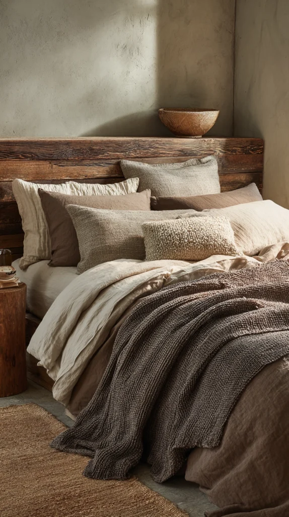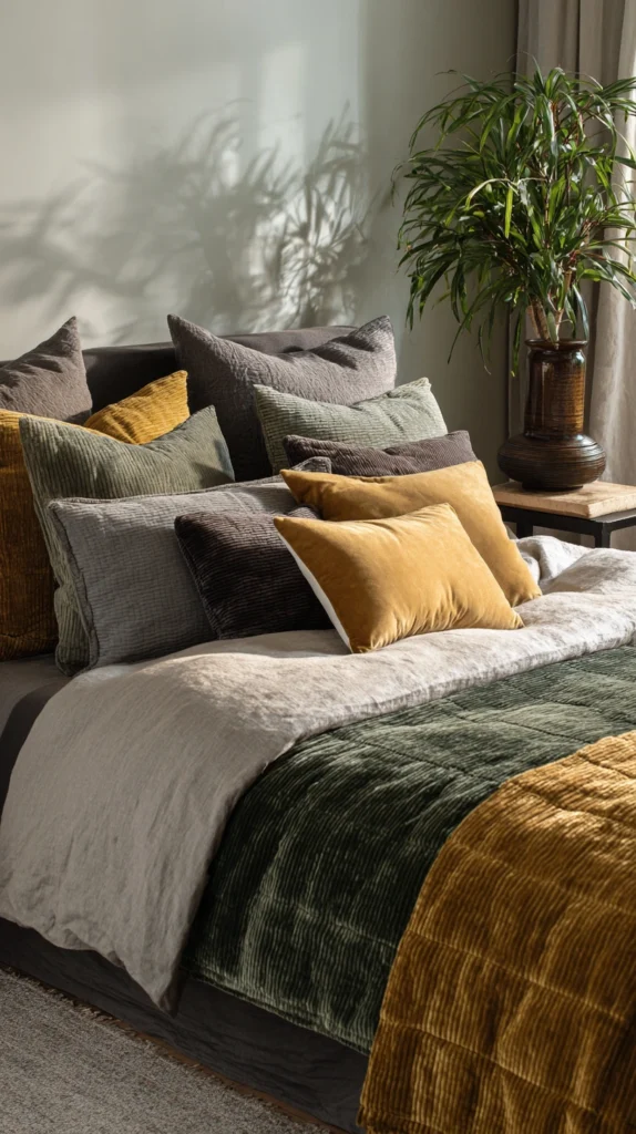 The most successful layered beds play with “fabric tension.” Pair the matte, slightly wrinkled texture of Belgian linen with the heavy, light-reflecting sheen of velvet. A linen duvet topped with a velvet lumbar pillow and a velvet quilt at the foot of the bed feels incredibly rich. The way these two fabrics interact with light adds a layer of sophistication that single-fabric beds lack.