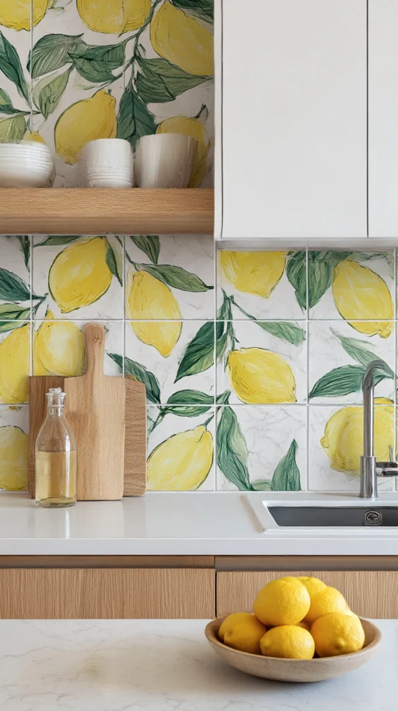 Hand-painted or printed ceramic tiles featuring lemon motifs used as a kitchen splashback bring the warmth and character of the lemon theme to the most prominent kitchen surface without requiring any other lemon element in the room to support them.