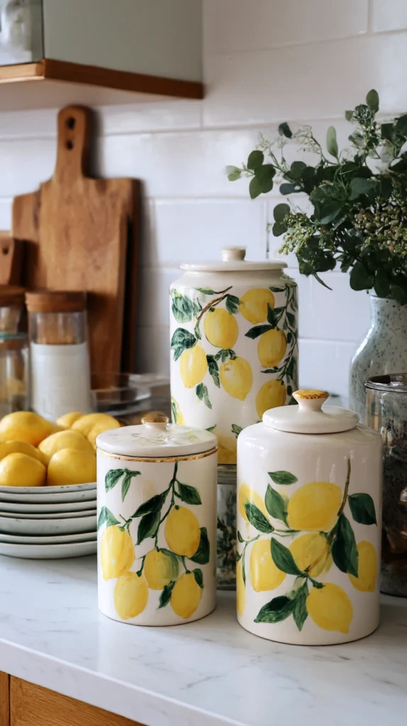 Lemon-print ceramic storage canisters in sets of three or four cost $30–$80 from kitchen homewares retailers and independent ceramicists. Individual jars in larger sizes for pasta and grains run $15–$30 each. Choose jars where the lemon illustration has a hand-painted or artisanal quality rather than a mass-produced printed label — the making quality is visible from across the room and determines whether the jars read as characterful or merely branded.