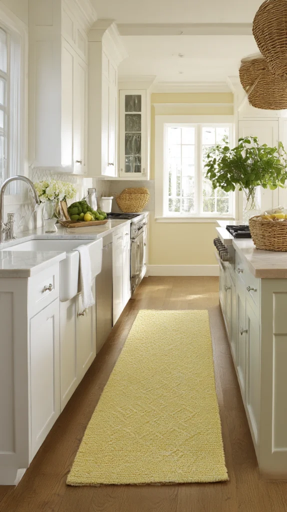 A runner rug in pale lemon yellow or a white and yellow stripe laid in front of the kitchen sink or along the main kitchen work run brings the lemon colour into the floor level of the kitchen — the surface that occupies the most visual space when the kitchen is viewed from the doorway — without affecting any fixed element of the room.