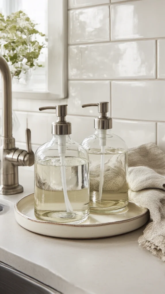 A pair of matching glass soap dispensers with brass pump tops costs $15–$35. Quality lemon-scented dish soap and hand wash to fill them costs $8–$20 per bottle. The dispensers should be refillable — a beautiful dispenser that cannot be refilled is a disposable object, and the decanting and refilling practice is itself part of the daily kitchen ritual that the styled sink area is built around.