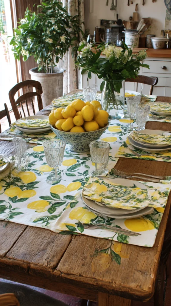 A cotton or linen tablecloth printed with a lemon botanical pattern — or a set of lemon-print placemats in the same fabric weight — brings the theme to the kitchen table in a way that is changed seasonally, laundered easily, and transforms the table from a bare surface to a styled one in thirty seconds of effort.