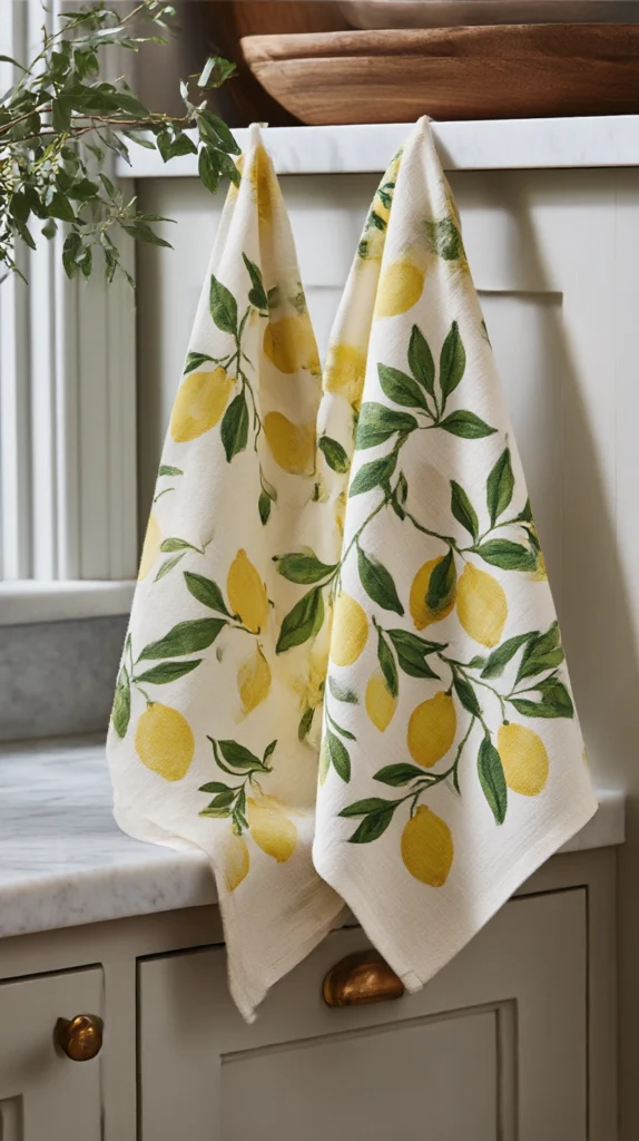 A set of linen or cotton tea towels printed with lemon botanicals — illustrated lemons, lemon slices, or simple citrus branch prints — is one of the most affordable and most immediately effective lemon kitchen additions available. Hung from the oven handle or folded over a rail, they register as a deliberate seasonal detail without requiring any structural change to the kitchen.