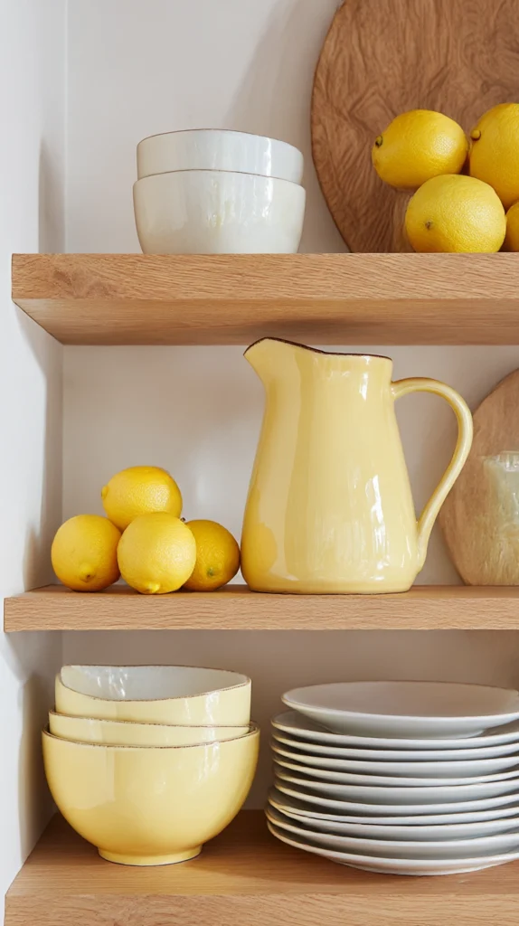 Introducing the yellow of a lemon through small functional kitchen objects — a yellow ceramic mug, a pale yellow mixing bowl, a lemon-yellow jug on the open shelf — creates the colour warmth of a lemon theme without a single piece of lemon-printed merchandise in the room.