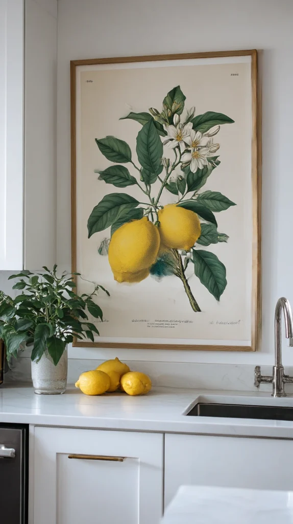 A large lemon botanical print — rendered in the style of a Victorian horticultural illustration, showing the whole fruit, cross-section, leaves, and blossom in careful detail — framed simply and hung on the kitchen wall is one of the most considered and most enduringly stylish ways to bring the lemon theme into the kitchen.