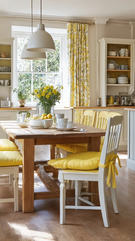 Tie-on seat cushions in yellow cotton or linen cost $10–$30 each. A set of four for a kitchen table runs $40–$120. Choose a plain yellow rather than a printed one — solid yellow cushions on plain chairs look elegant and considered. Printed lemon cushions on the same chairs look themed, which is a different and less versatile quality in a kitchen used daily.
