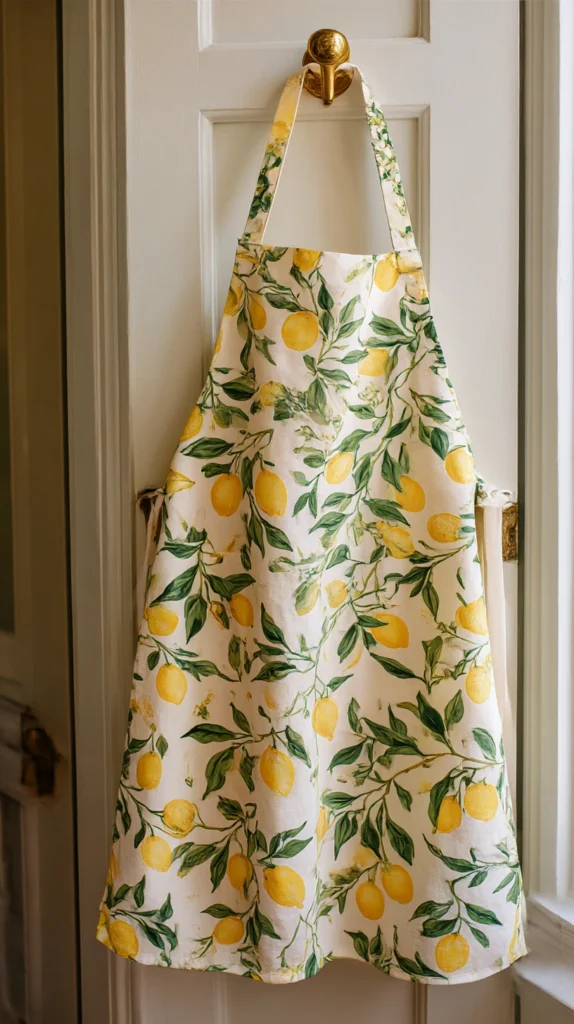 A well-made cotton or linen apron printed with a lemon botanical or a simple lemon motif — hung from a hook on the kitchen wall or the back of the pantry door when not in use — functions simultaneously as a useful kitchen item and as a piece of kitchen wall decor that contributes to the lemon scheme every day.