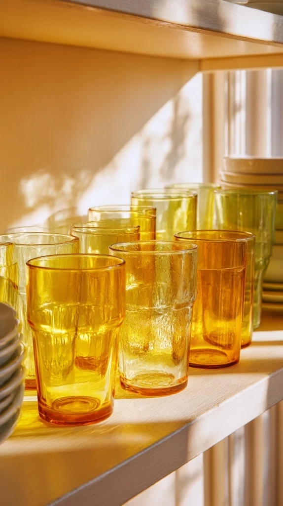 Tinted yellow glassware sets of four cost $20–$50 from homewares retailers and online marketplaces. Murano-style hand-blown yellow tumblers run $12–$20 each for a more artisan quality at the higher end. Display on an open shelf where the light passes through the coloured glass — yellow glass in direct or indirect natural light has a warmth and glow that is entirely lost inside a closed cupboard.