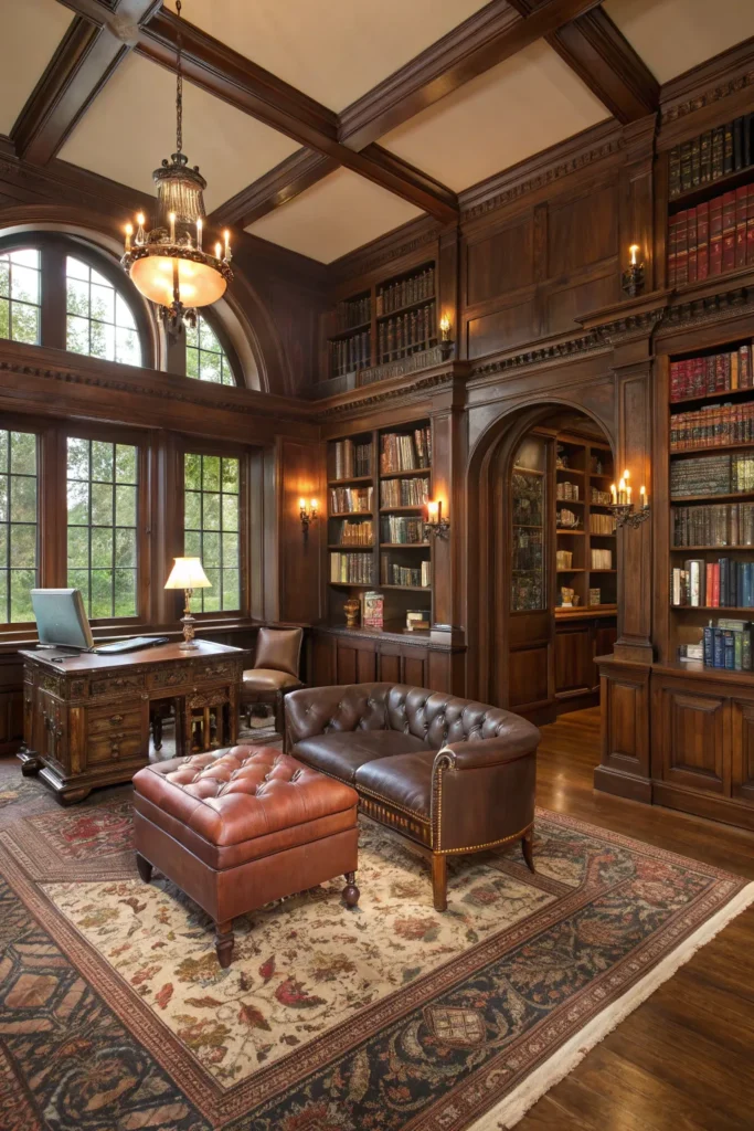 - Floor-to-ceiling built-in bookcases in dark walnut or mahogany