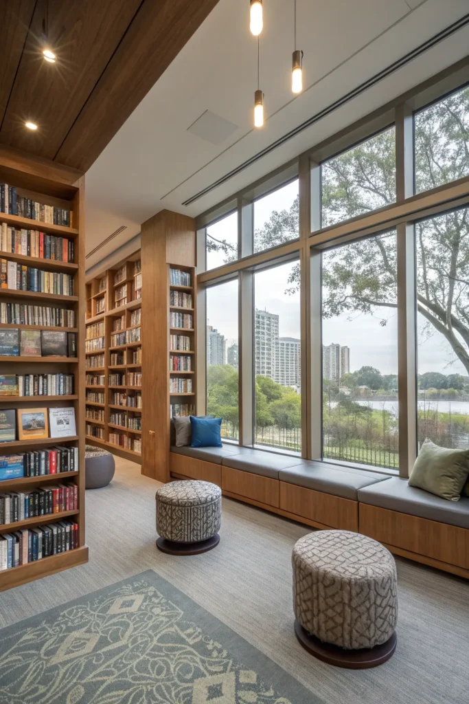 Lighting plays a crucial role in any successful library. Proper illumination prevents eye strain during extended reading sessions while creating ambiance that makes the space inviting for both daytime and evening use. Combine natural light with adjustable task lighting and warm ambient lighting to create a comfortable reading environment throughout the day.