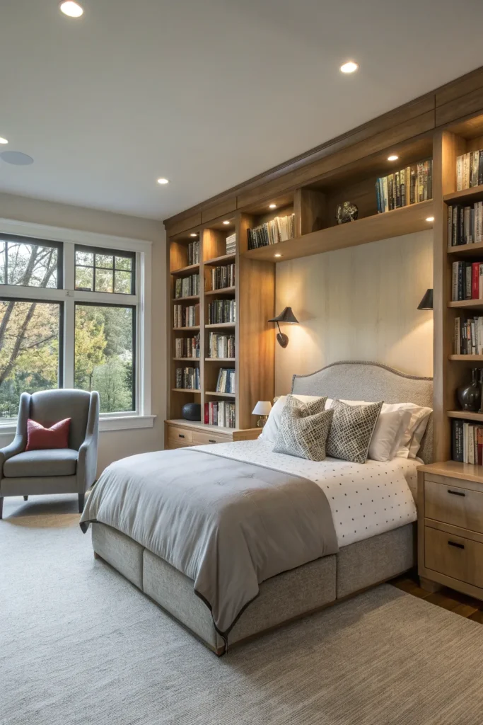 Integrate library functions into a master bedroom for convenient bedtime reading.