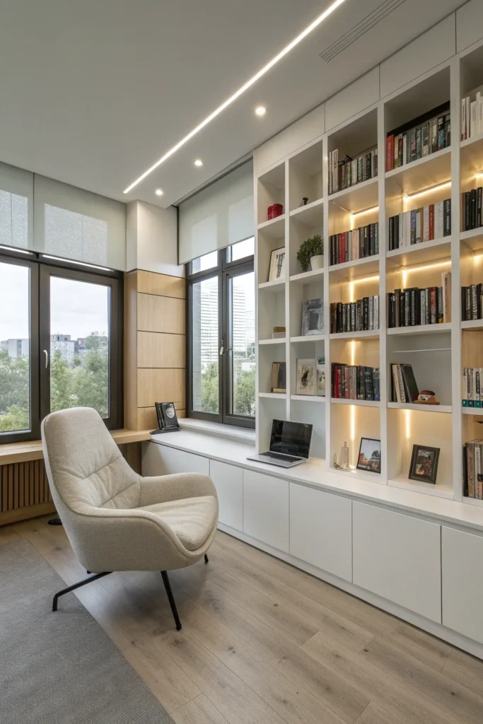 Design a contemporary library focusing on clean lines, functional storage, and serene simplicity.