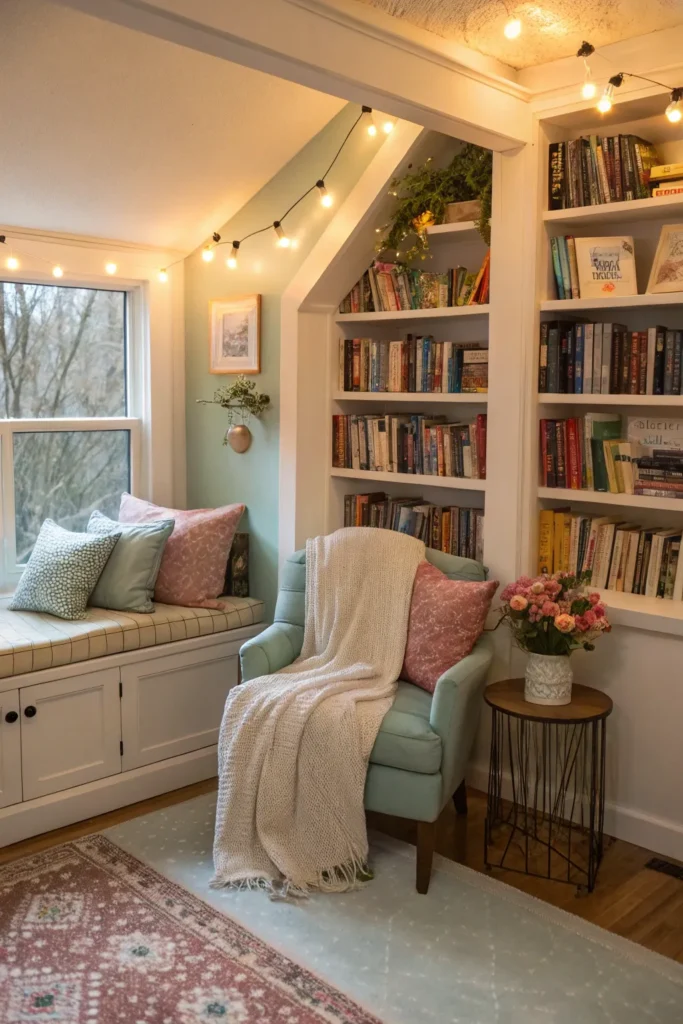 Transform a small space into an intimate reading retreat with cottage-style charm and comfortable furnishings.