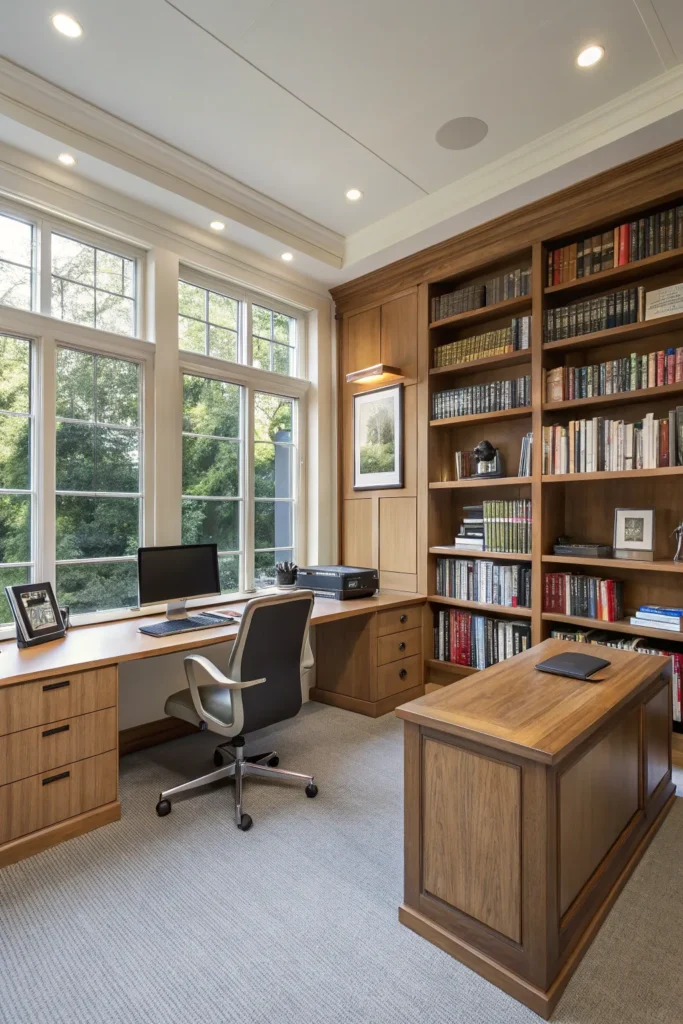 Create a dual-purpose space that serves both serious work and leisure reading needs.