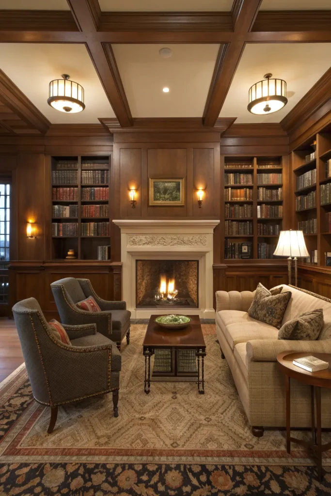 Design a warm, inviting library centered around a fireplace for year-round comfort.