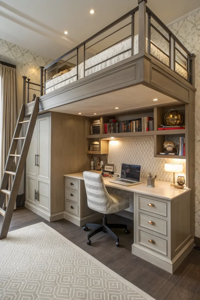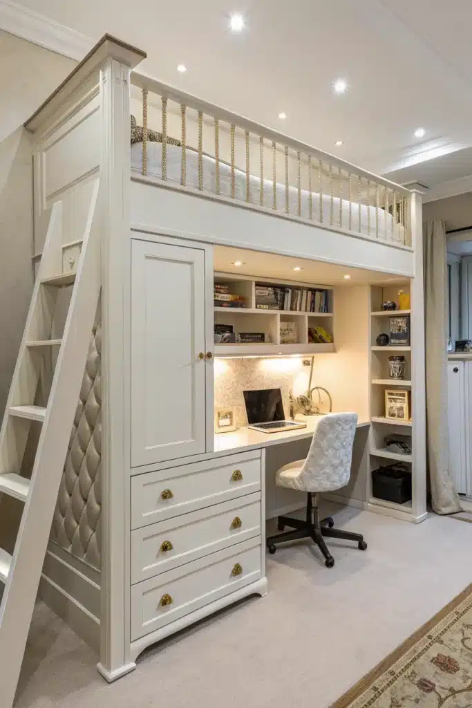 A full workstation under the loft bed can be extremely useful for teens and adults. Add a wide desk, comfortable chair, shelves, and good lighting to create a productive work environment. This layout is great for those who need both a bedroom and a home office in one compact space.