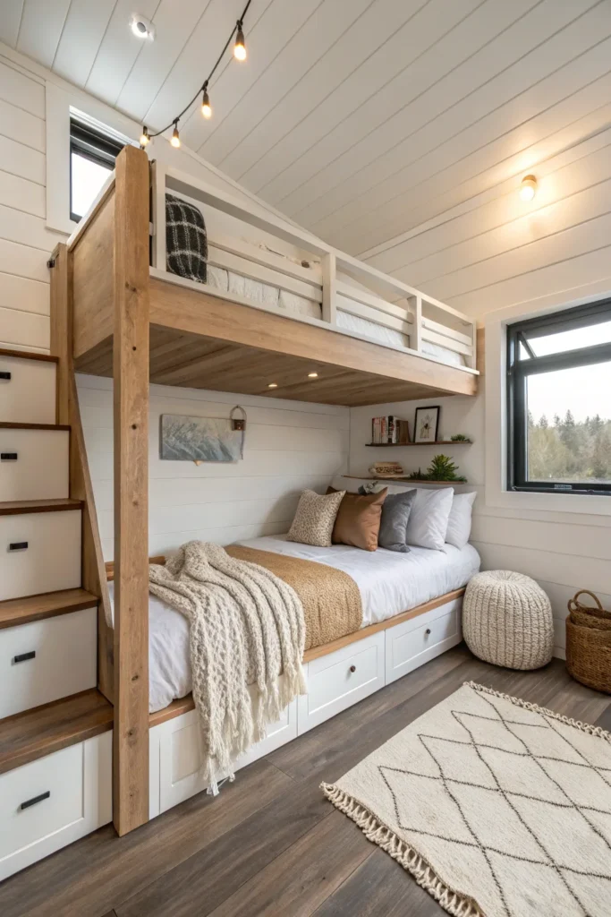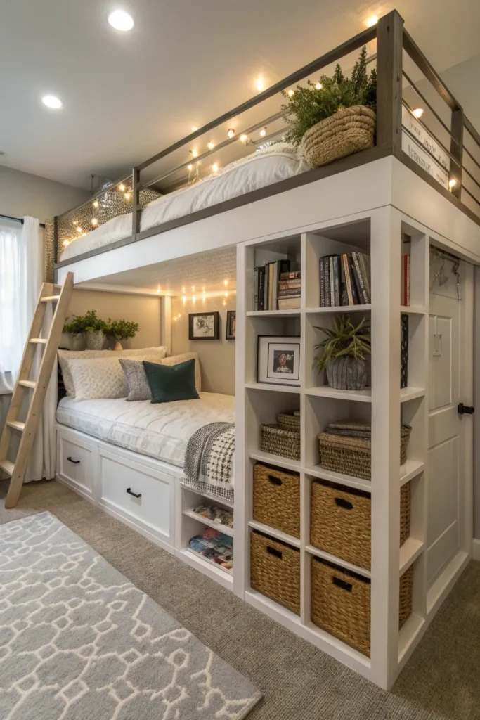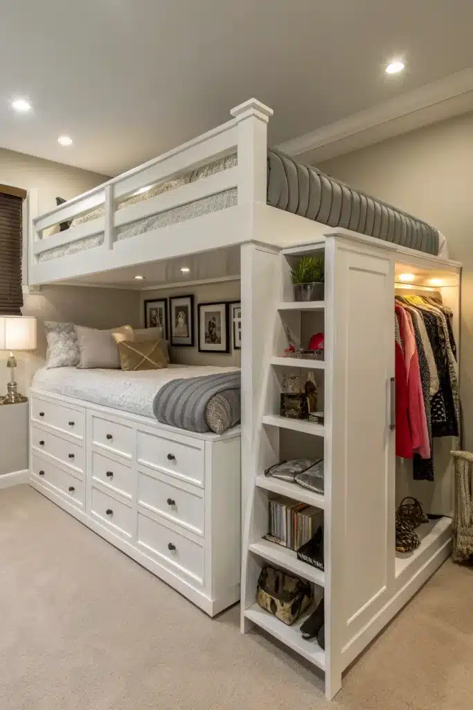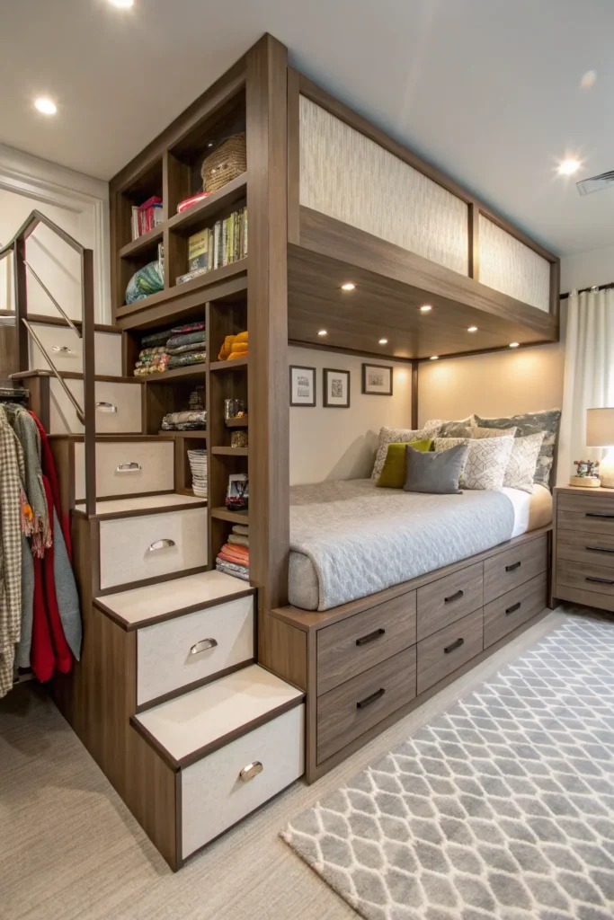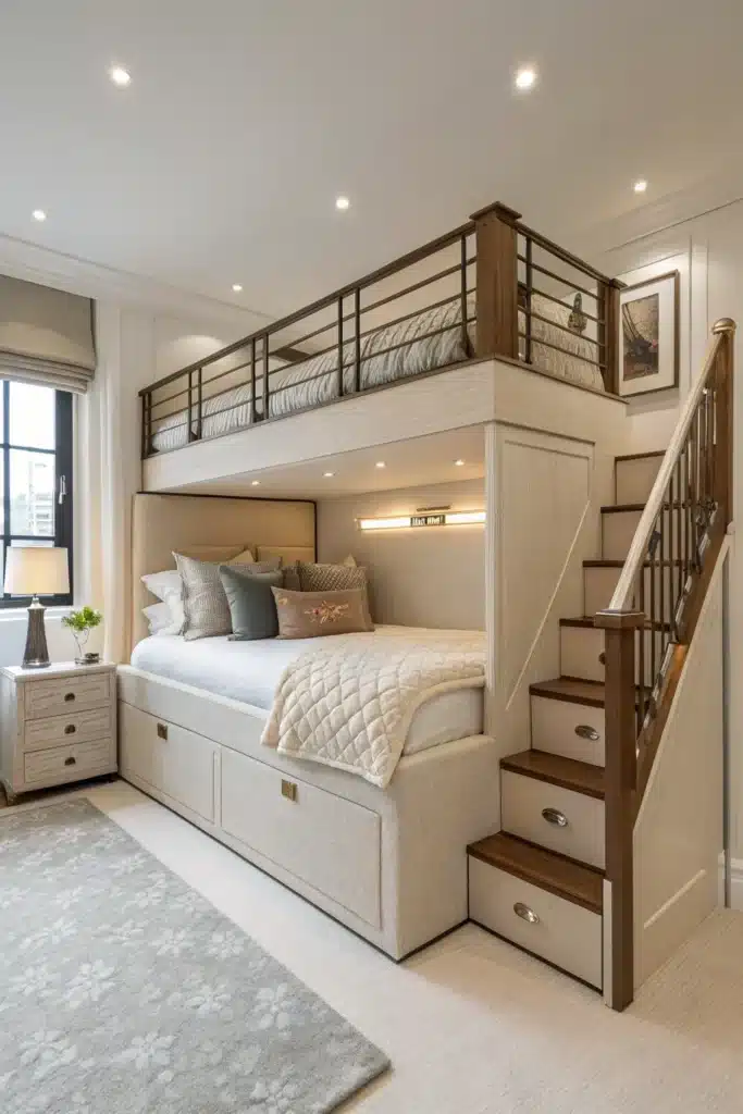 Instead of a ladder, choose loft beds with built-in steps that double as storage drawers. These steps are safer for kids and offer an easy way to organize toys, clothes, books, and more. This clever design uses vertical space efficiently while keeping the room tidy.