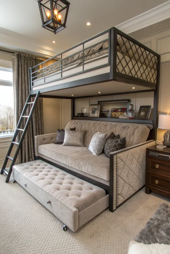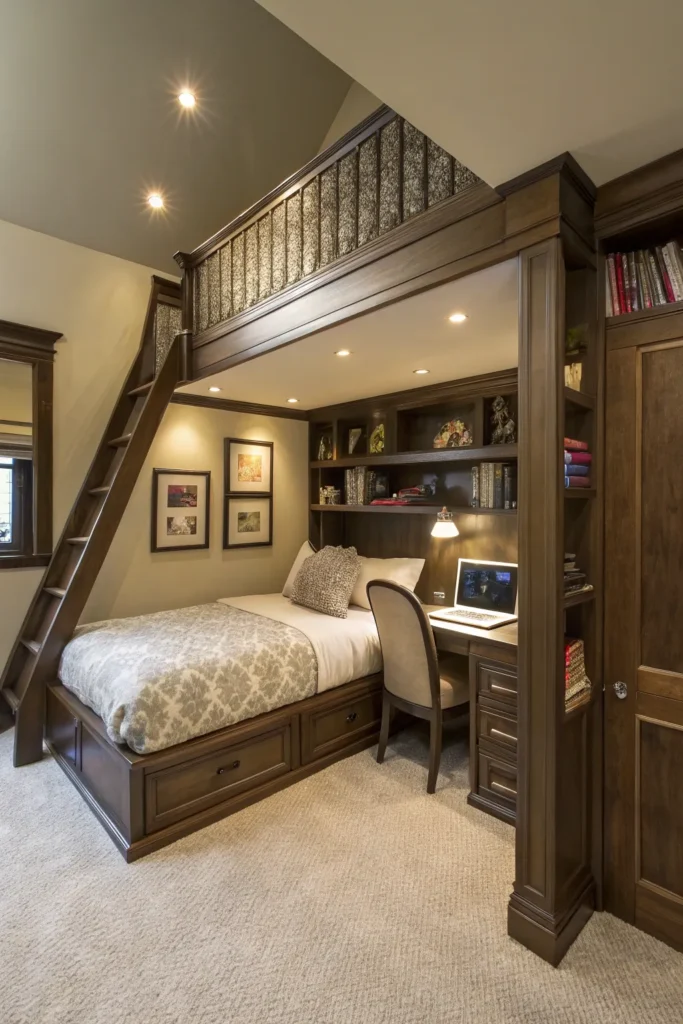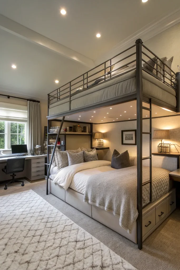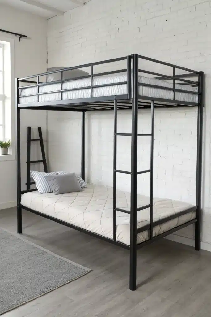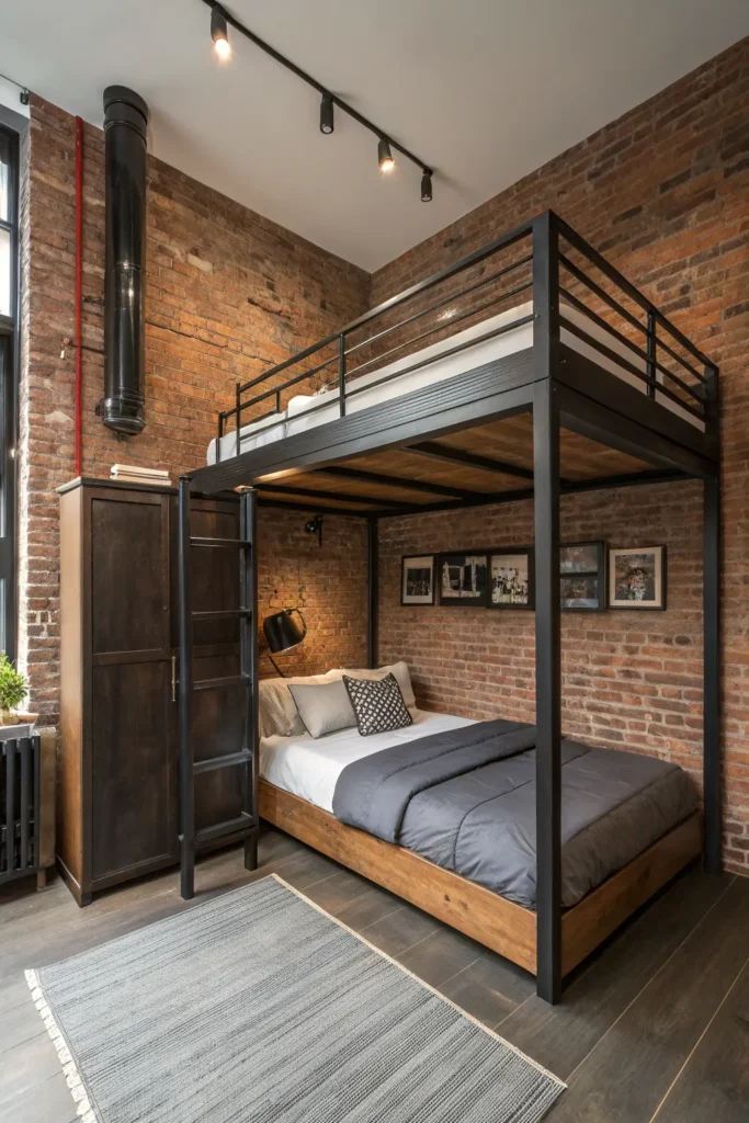 An industrial loft bed adds character and modern flair to small rooms. Think metal frames, wood accents, and clean lines. These beds pair well with brick walls, dark tones, and minimalist decor, creating a stylish yet functional space.