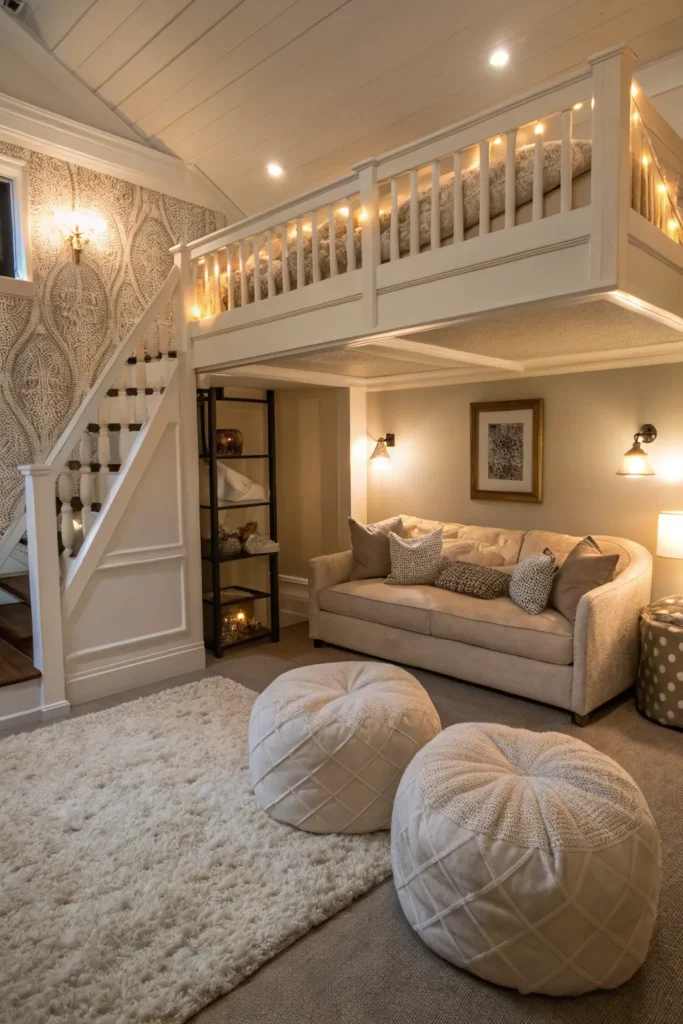 Turn the space under your loft bed into a comfortable lounging corner. Add a small sofa or bean bags, a soft rug, and warm lighting to create a relaxing environment for reading, watching movies, or gaming. This idea makes small rooms feel cozy without taking up additional floor space.