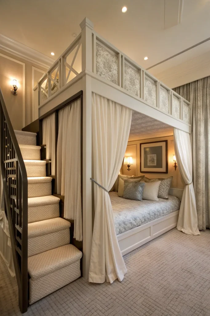 Adding curtains around the loft bed can transform the sleeping area into a private, cozy retreat. Light fabrics prevent the space from feeling boxed in, while also offering a sense of calm and separation. This idea works especially well in shared rooms where personal space is essential.