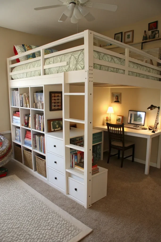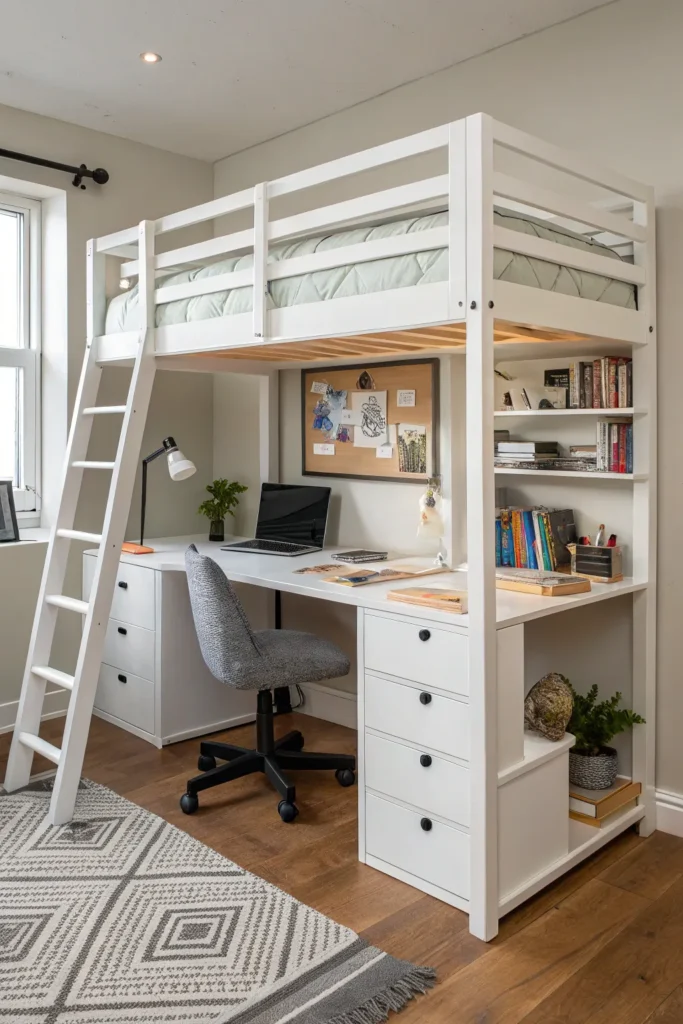 A full workstation under the loft bed can be extremely useful for teens and adults. Add a wide desk, comfortable chair, shelves, and good lighting to create a productive work environment. This layout is great for those who need both a bedroom and a home office in one compact space.