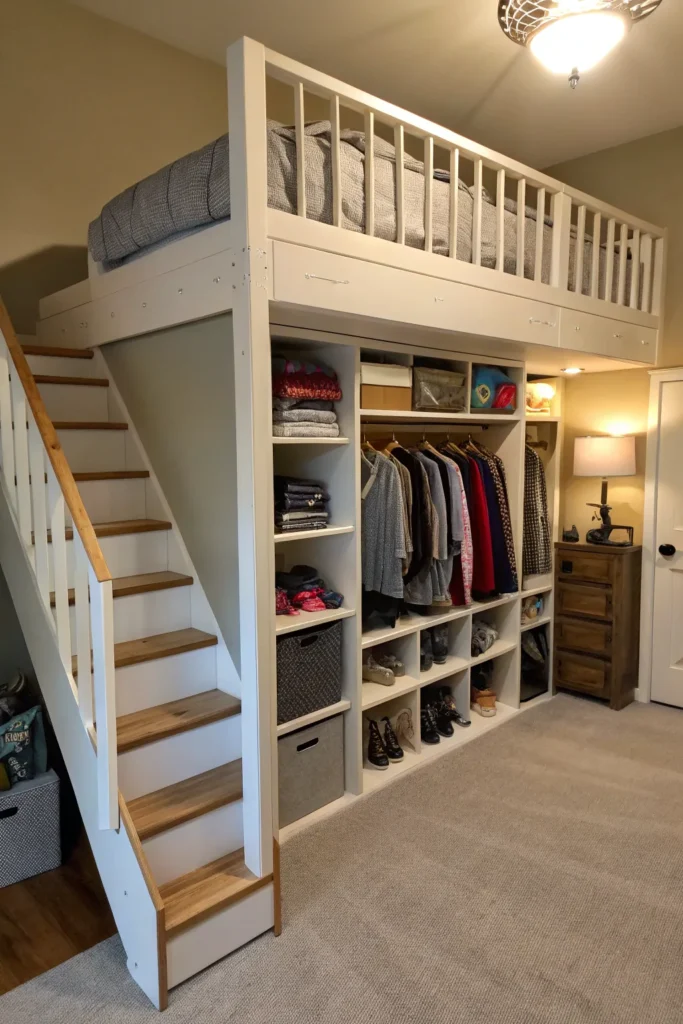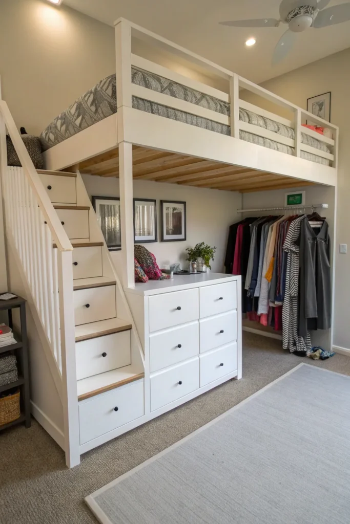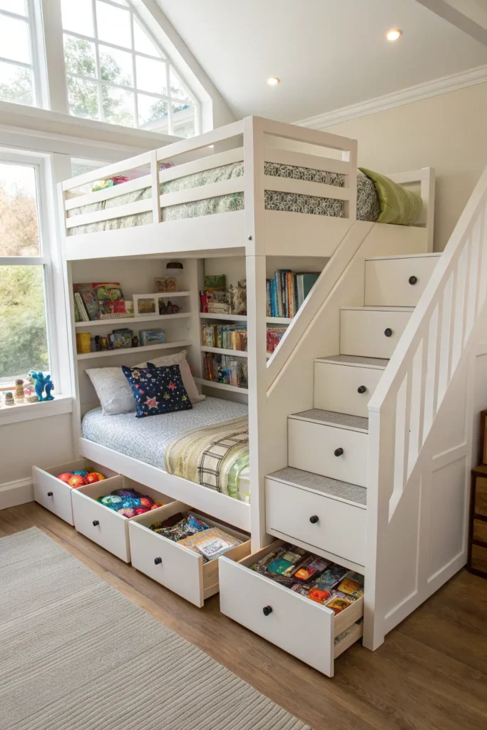 Instead of a ladder, choose loft beds with built-in steps that double as storage drawers. These steps are safer for kids and offer an easy way to organize toys, clothes, books, and more. This clever design uses vertical space efficiently while keeping the room tidy.