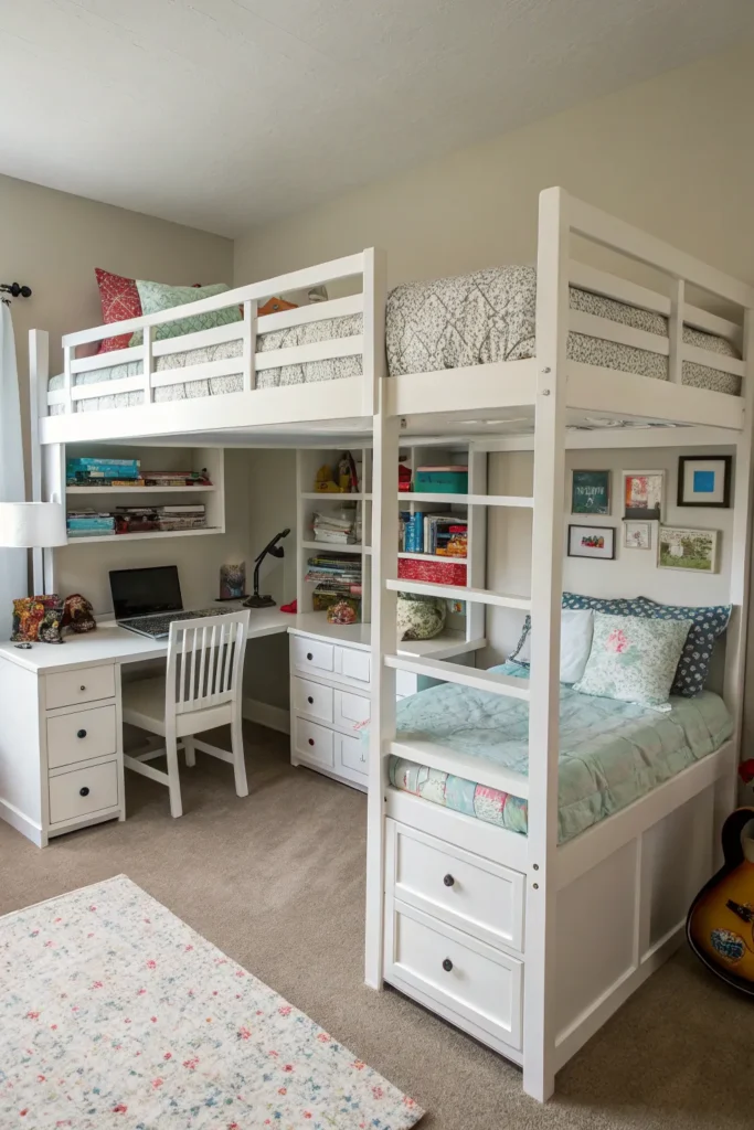 In shared bedrooms, a double loft bed system can be a lifesaver. By placing two loft beds in the room, you free up the entire lower space for desks, play areas, or collective storage. It’s an excellent option for siblings or roommates who need to make the most of a small shared space.