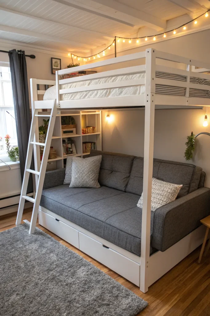 A loft bed with a pull-out sofa underneath is perfect for multi-purpose rooms or apartments where space is limited. The sofa can be used for lounging during the day and transformed into a guest bed when needed. It’s a practical and comfortable solution for rooms that serve multiple functions.