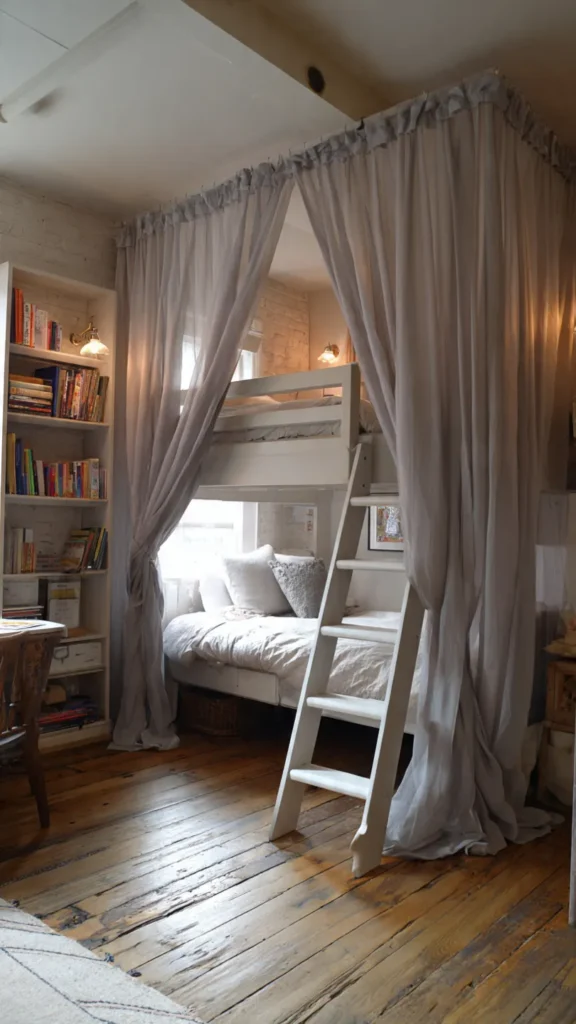 Adding curtains around the loft bed can transform the sleeping area into a private, cozy retreat. Light fabrics prevent the space from feeling boxed in, while also offering a sense of calm and separation. This idea works especially well in shared rooms where personal space is essential.