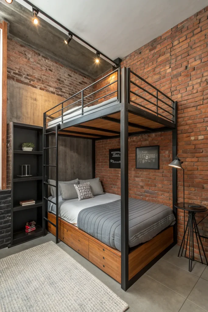 An industrial loft bed adds character and modern flair to small rooms. Think metal frames, wood accents, and clean lines. These beds pair well with brick walls, dark tones, and minimalist decor, creating a stylish yet functional space.