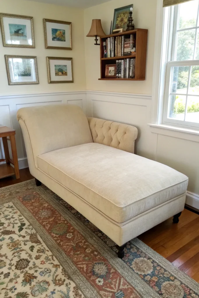 A low-profile chaise lounge can provide the relaxation benefits of a full sofa while occupying less visual space through its elongated, horizontal emphasis. Single-arm designs with extended chaise sections offer comfortable lounging without the bulk of traditional sectionals.