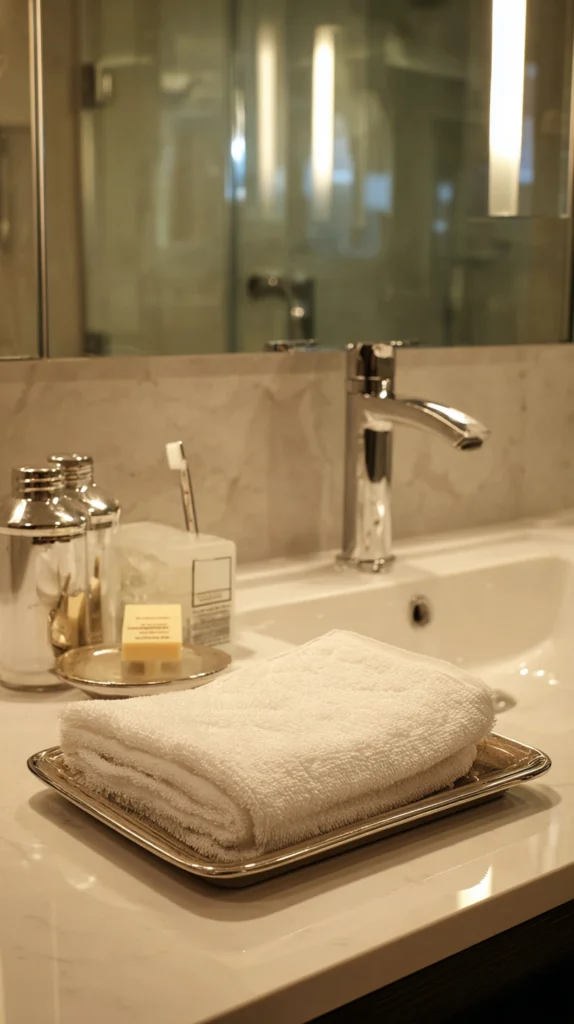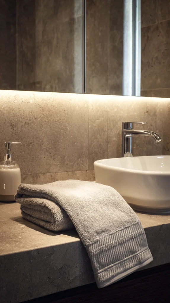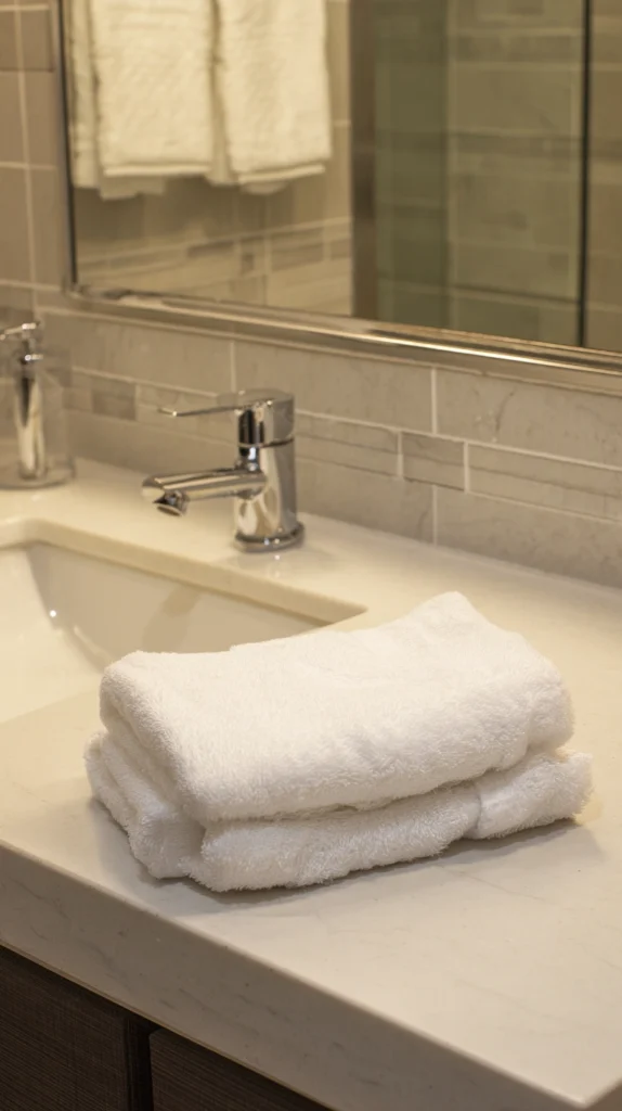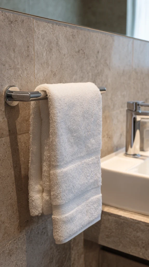 Style tip: Stack towels in the same consistent order every time — bath towels below, hand towels above, face cloths on top — rather than replacing them in whatever order they are laundered. A consistent stacking sequence creates a display that reads as deliberately maintained rather than casually replaced. The order takes no additional time to maintain and makes the difference between a towel stack that looks like a hotel and one that looks like a linen cupboard shelf.