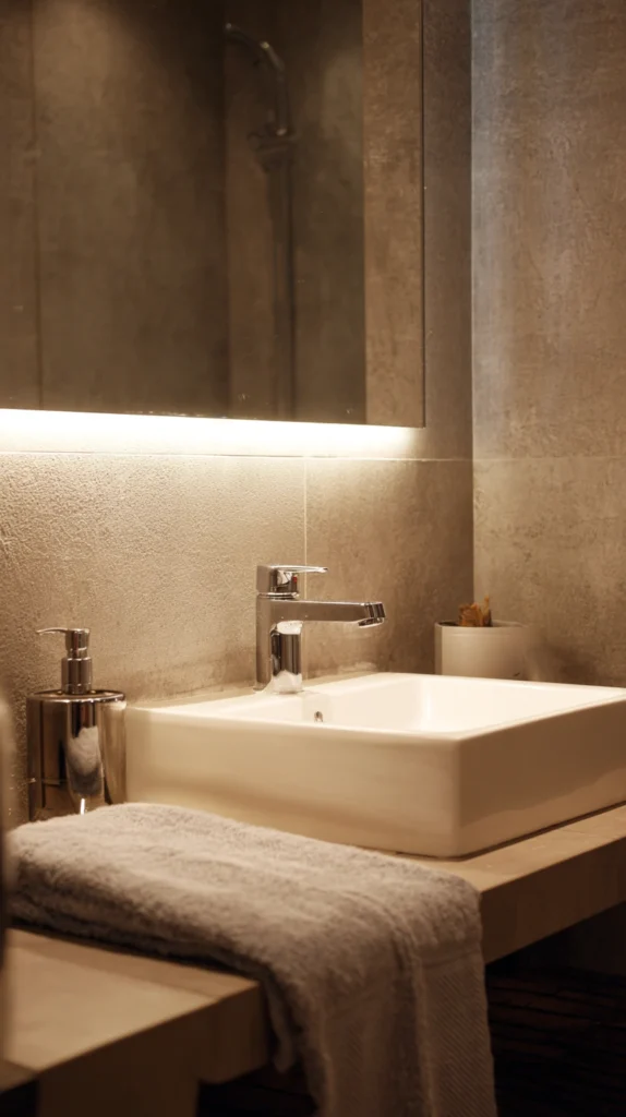 Battery-operated LED candles with a realistic flicker cost $5–$15 for a set of six. A small ceramic table lamp suitable for a vanity surface costs $30–$80. A warm-white LED strip behind a frameless mirror costs $15–$40. Use all three at their lowest setting simultaneously for the most genuinely spa-like evening lighting in any bathroom without touching a single electrical installation.