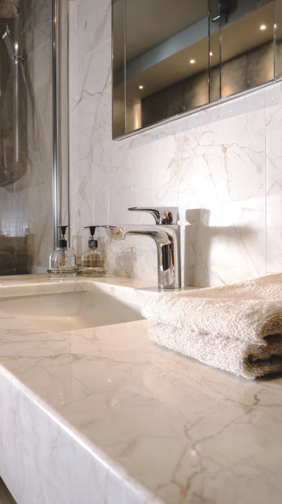 Peel-and-stick marble-effect contact paper applied to a bathroom vanity top, the side of a bath, or a feature wall creates the visual quality of real marble at a fraction of the cost and without any permanent alteration to the surface beneath it — making it one of the most accessible luxury upgrades available for renters or anyone working to a tight budget.