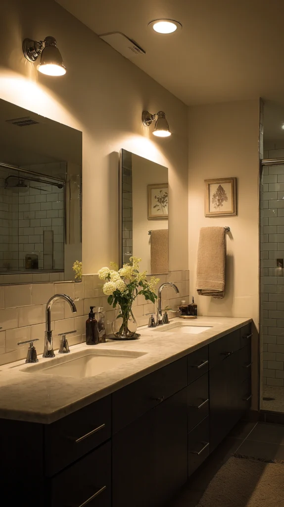 Style tip: Set the dimmer at 30–40 percent of full brightness for a bath and 60–70 percent for a shower. The specific levels that feel right vary by bathroom and bulb temperature — spend five minutes finding the settings that make the room look and feel best at each use before calling the installation complete. The right light level is always lower than instinct suggests.