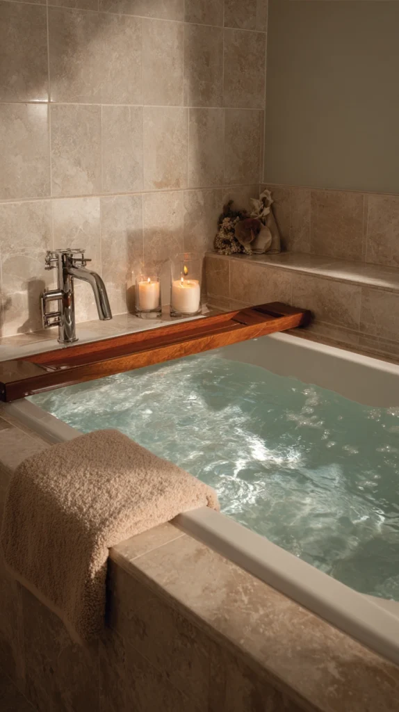 A bathroom lit by a single overhead fixture is a bathroom lit for function. A bathroom with an overhead light supplemented by candles, a small table lamp on the vanity surface, or a wall-mounted LED strip behind a mirror has layers of warm light at different heights that create an atmosphere no single source can achieve regardless of its quality or wattage.