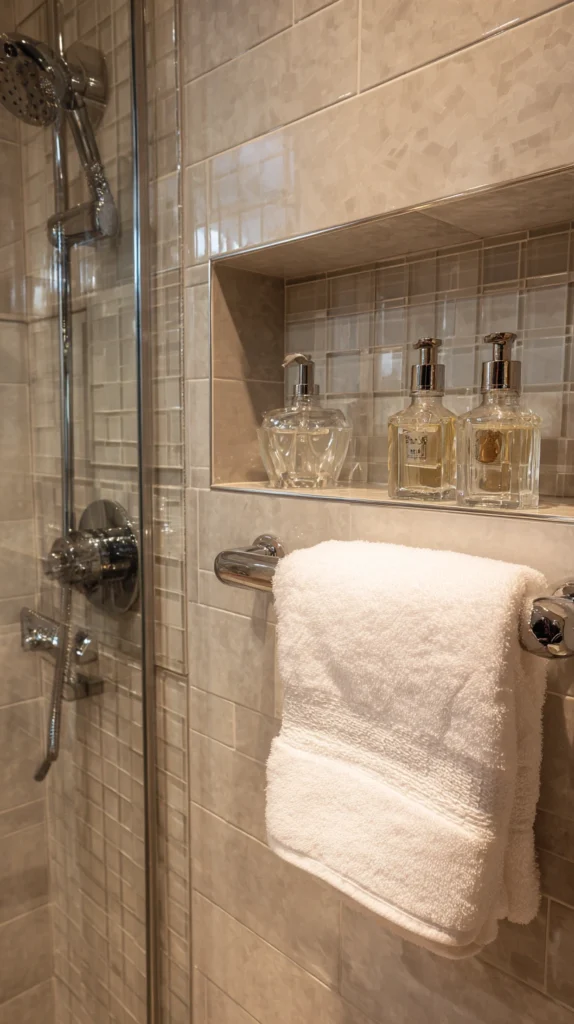 Replacing plastic shampoo, conditioner, and body wash bottles with a set of matching glass or ceramic pump dispensers is one of the most transformative visual upgrades available for a shower or bath surround. The visual noise of ten different branded plastic bottles disappears and is replaced by three matching vessels that make the bathroom look like a luxury hotel suite.