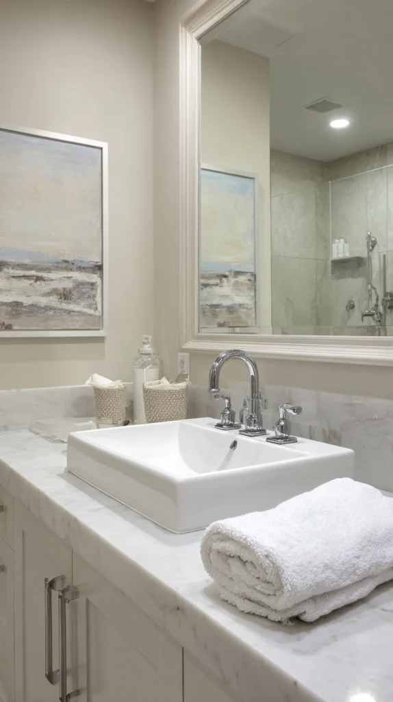 Style tip: Hang the mirror or artwork at the eye level of someone standing at the vanity rather than centred on the wall in the abstract. Bathroom art seen primarily from a standing position should be mounted for that perspective — slightly lower than standard gallery height — which keeps it in the natural field of vision without requiring any deliberate effort to look at it.