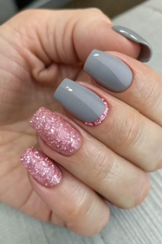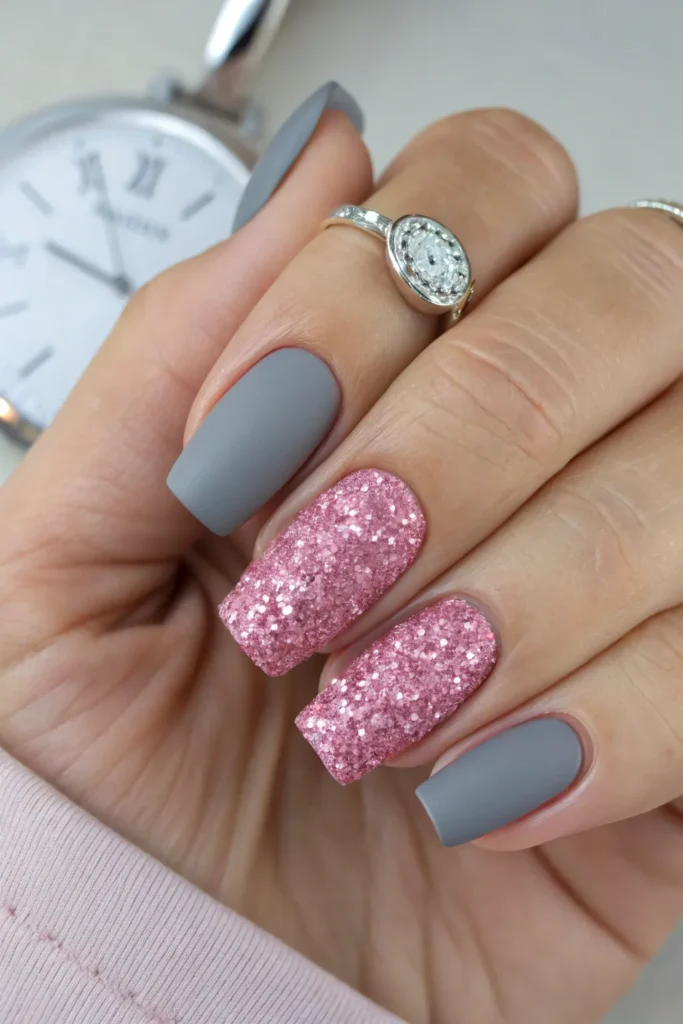 Why Matte Gray and Pink Glitter Nails Are a Timeless Choice