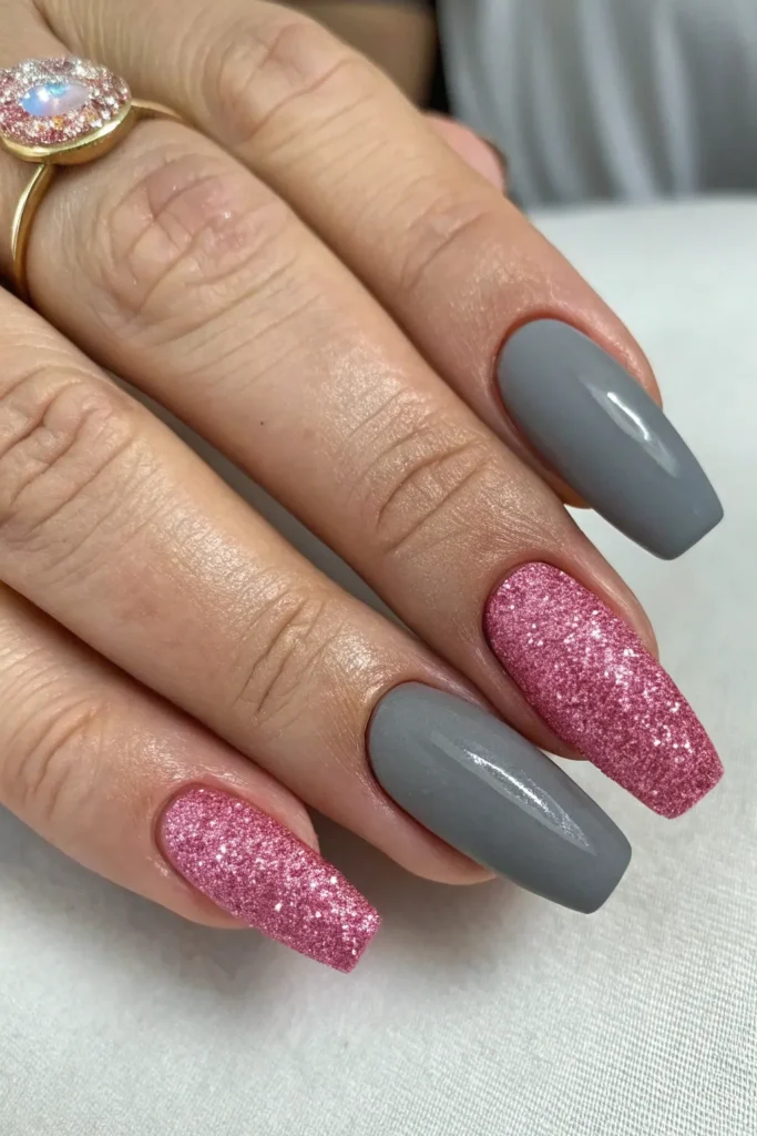 The pairing of matte gray and pink glitter is a modern favorite that blends elegance with a playful sparkle. Matte gray brings depth, calmness, and sophistication, while pink glitter introduces vibrance, femininity, and a hint of glamour. This versatile combination works well for every occasion, whether you want a subtle office-appropriate manicure or a bold party-ready statement.
